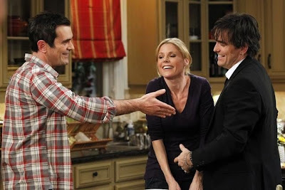 Actress Sofia Vergara and Julie Bowen on the set of 'Modern Family' in Los Angeles, CA. Also on set was Sofia's son Manolo Gonzalez. ( March 17, 2011 - Photo by Photo Agency)